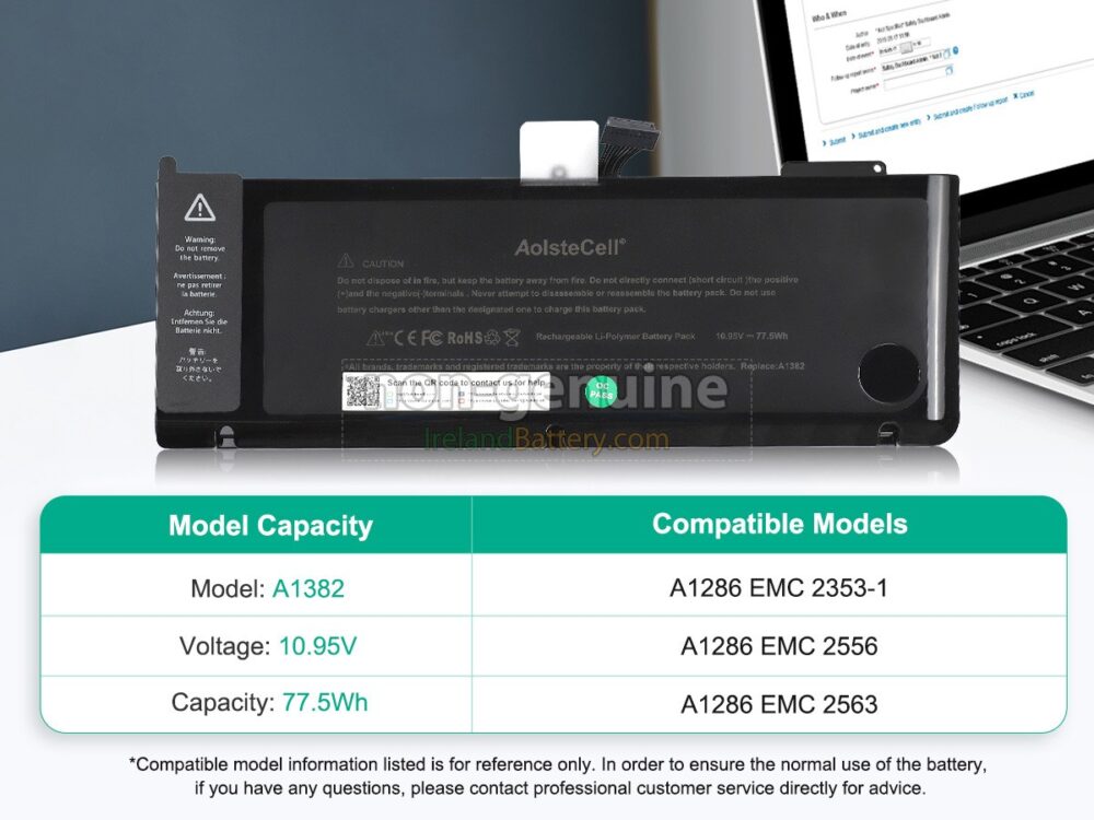 התאמה מלאה לדגמי Apple MacBook Pro 15" (סדרת 2011-2012): סוללה מקורית עם מספר דגם A1382, מספקת תמיכה מושלמת לדגמים המתאימים ומבטיחה עבודה חלקה ללא תקלות.